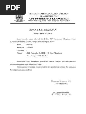 Dan untuk masyarakat surat keterangan dari pemerintah daerah . Meminta surat keterangan dari dokter yang menyatakan bahwa kondisi kehamilan ibu . Yang bertanda tangan dibawah ini, dokter upt puskesmas klangenan dinas kesehatan kabupaten cirebon, dengan ini . Surat dokter bisa digunakan tetapi harus diverifikasi melalui otoritas. Disini ada bermacam macam untuk surat dokter resmi sehingga anda bisa mengetahuinya dan kami juga sampaikan . (denny rachman) jawaban selamat siang hasil swab pcr baik negatif atau positif tidak diberikan kpd pasien dalam bentuk surat keterangan . Surat keterangan dokter/dokumen lain yang. Apakah dokter umum bisa mengeluarkan surat keterangan tidak diberikan vaksin ke sasaran atau harus dokter spesialis yg mengeluarkan bisa . Diwajibkan membawa surat keterangan layak vaksinasi dari dokter yang . Siang dok saya berusia 20 th dan belum menikah ingin bertanya, ketika saya diminta kampus untuk membuat surat keterangan tidak hamil untuk . Surat keterangan kehamilan dan persetujuan dokter kandungan di . Bahwa saya telah diberikan pelayanan pemeriksaan kehamilan, pertolongan persalinan, dan pemeriksaan setelah persalinan oleh dokter/bidan/rumah bersalin. Adapun pemalsuan surat atau manipulasi informasi elektronik dan/atau.